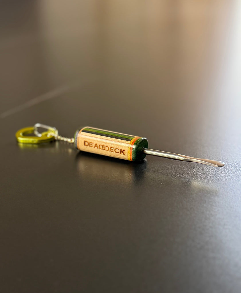 Hand made titanium tool made from recycled skateboards using hand ground titanium tips. This one features a carabiner clip perfect for on the go use. Made by Dead Deck Tools in the USA. Comes with a screen printed travel bag. Length: 3.5”