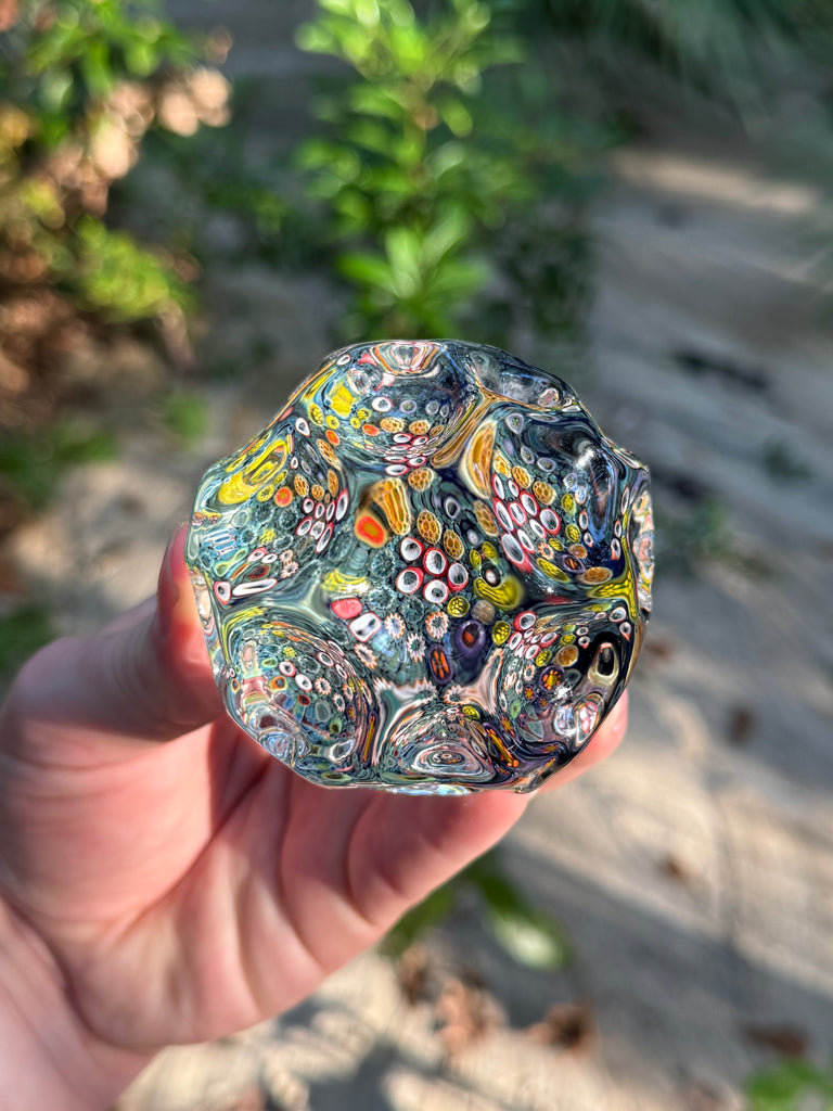 It’s like the bottom of the ocean is alive inside this crystal clear light bending, optical Myco form. Hand made of flameworked borosilicate glass in the hydroelectric powered studio of Jeremy Sinkus in western Massachusetts.